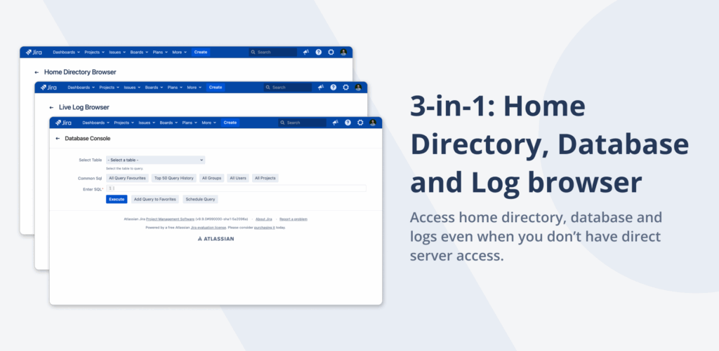 Stop waiting for server access. Instantly browse files, query databases, and view logs directly from your Jira admin interface—no terminal required.